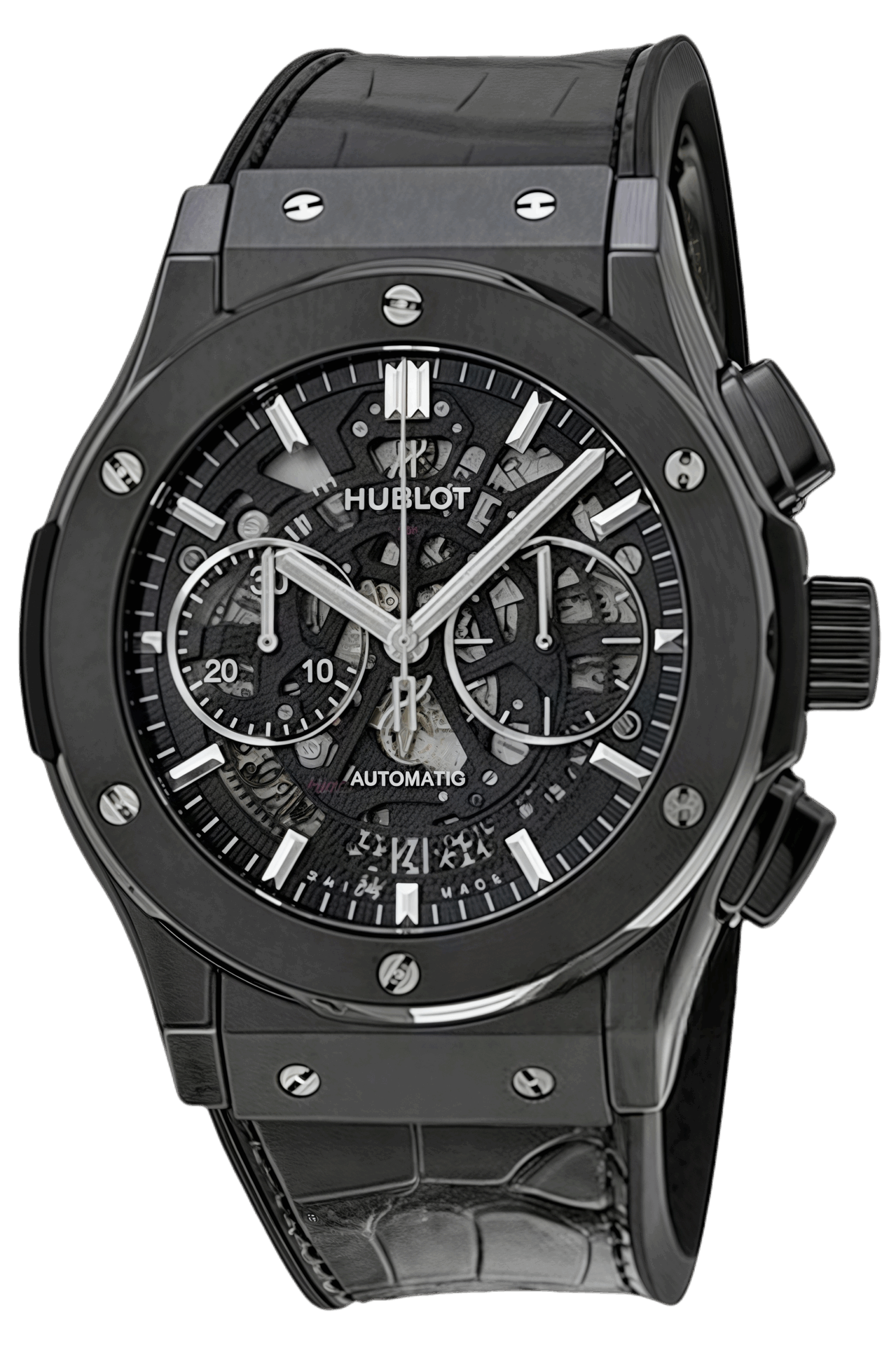 Hublot Classic Fusion Ref. 525.CM.0170.LR Super Clone Watch – Black Ceramic Black Dial Chronograph Leather Strap Fake Replica