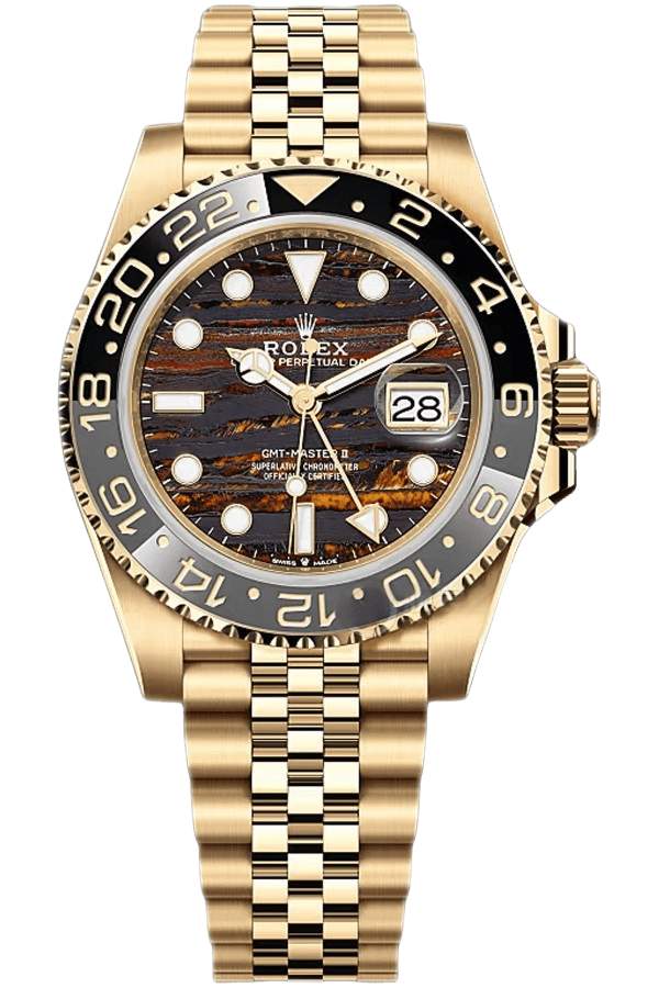 | Note: 1:1 Super Clone Rolex GMT-Master II with black dial and two-tone Cerachrom bezel. Finished in 18k yellow gold with Swiss 3285 clone automatic movement and Oyster bracelet. | |