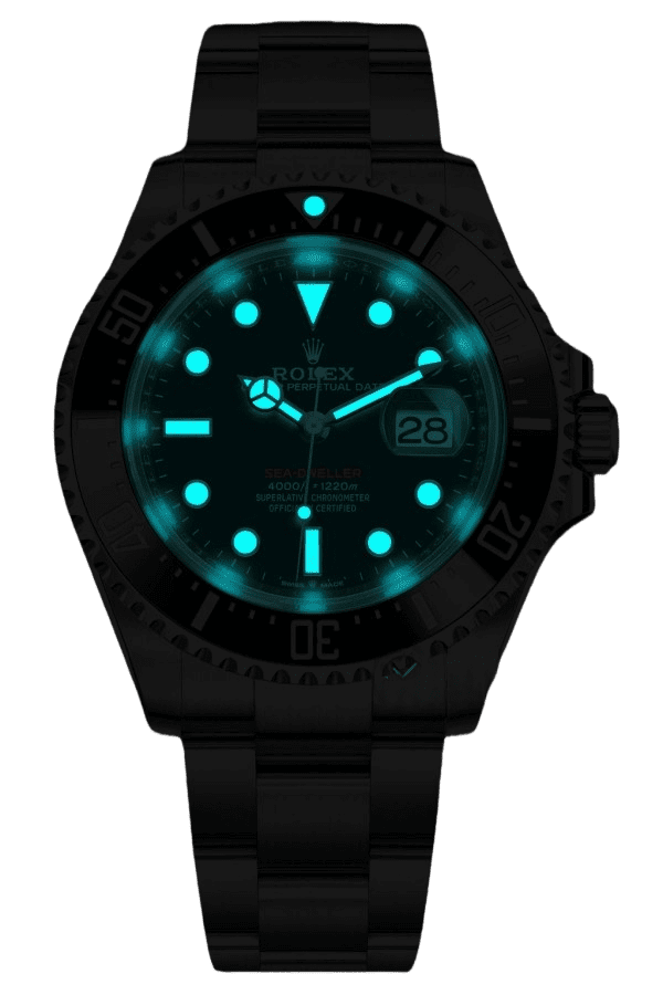 | DIAL | – Black Dial with SEA-DWELLER written in RED TEXT – Hour Markers and Hands coated with Bright Superluminova Blue Luminescence Phosphorescent Lume that glows up to 4 to 6 hours at night with uniform luminosity throughout – Exact 1:1 Correct Font Size and highly legible Chromalight display |