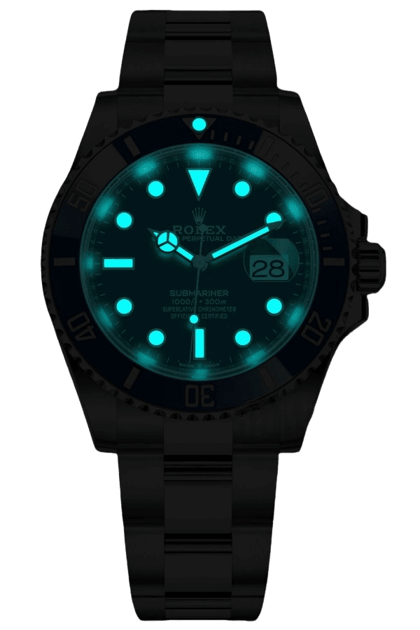 | DIAL | – Black Dial – Hour Markers and Hands coated with Bright Superluminova Blue Luminescence Phosphorescent Lume that glows up to 4 to 6 hours at night with uniform luminosity throughout – Exact 1:1 Correct Font Size and highly legible Chromalight display |